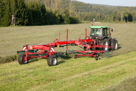 Nový zhrňovač krmovín do strany Kverneland 9577 S s ovládaním riadenia je vybavený 12/13 dvojitými tangenciálnymi ramenami s prstami.